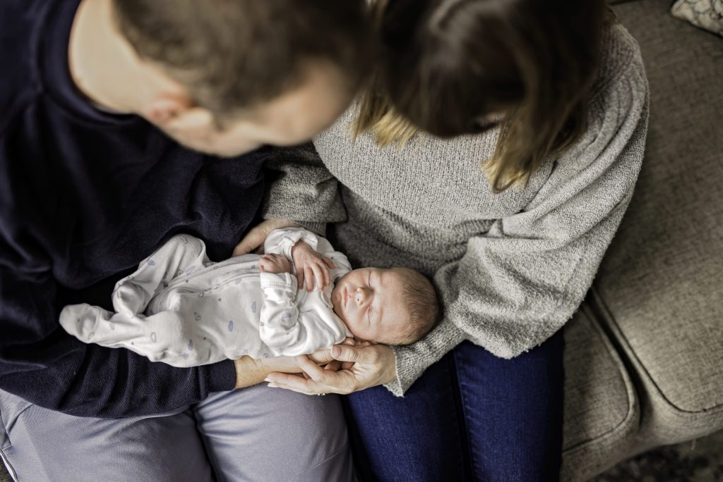 My favorite shots that I take for lifestyle newborn portraits are candid shots in the house. These can be taken in the living room, a bedroom, or a nursery. We will get shots of you and your partner holding the baby. One of my favorite things to photograph are you and your partner reading books to the baby 🙂